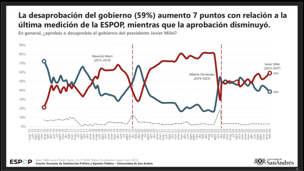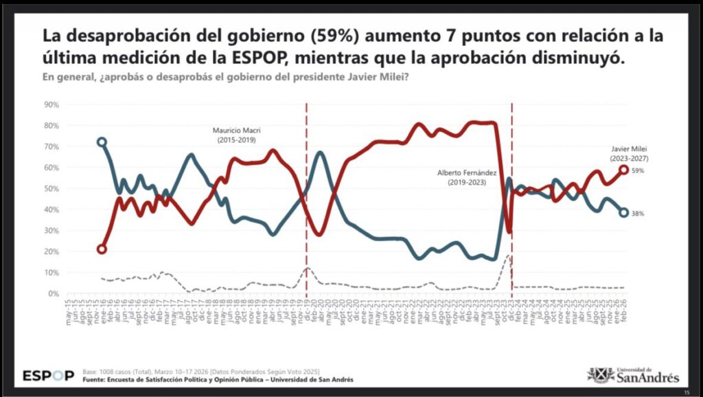 Hoy el escenario tiene una geometría diferente, pero una lógica idéntica. Las encuestas muestran una caída sostenida de Javier Milei. Tanto Atlas Intel, termómetro de referencia de la opinión pública, como la Universidad de San Andrés, entre muchas otras, registran números que seguro prenden luces de alerta en el tablero de control del Gago del Kremlin.